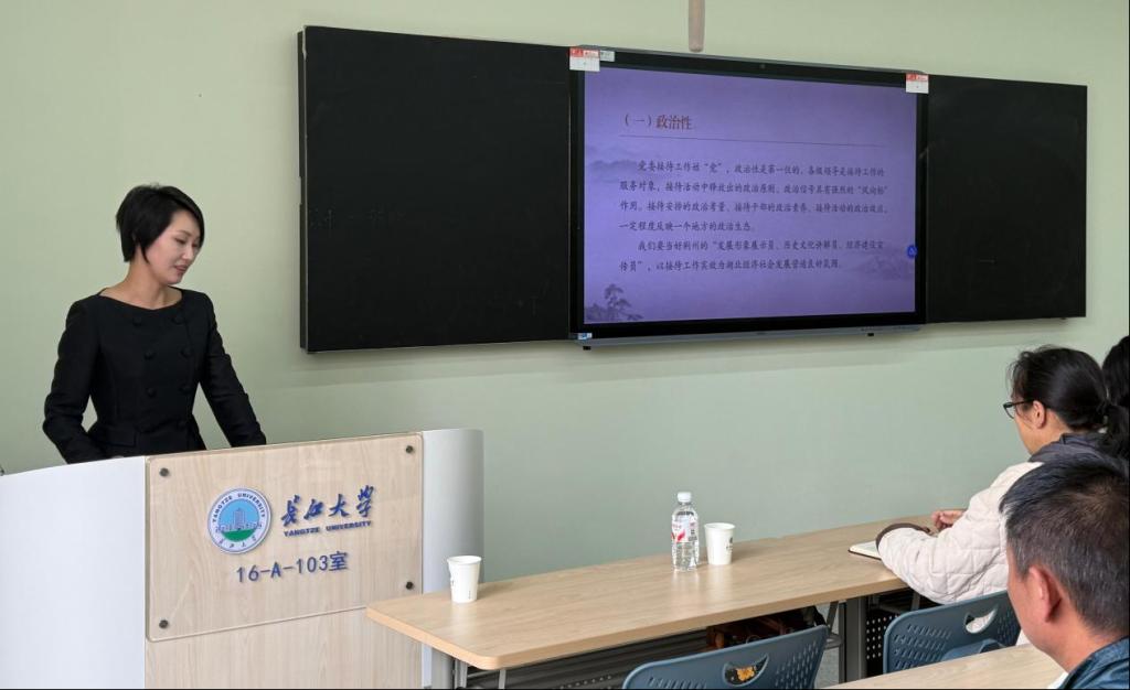 王霞科长以《围绕中心,服务大局,高质高效地做好公务接待工作》为主题。结合多年一线接待工作经验,从新时代公务接待工作特性、公务接待基本流程、公务接待礼仪规范三个方面进行了深入浅出的讲解,并结合案例系统阐述了公务接待工作的时代内涵与使命担当。她指出,接待工作不仅是连接内外的桥梁、展示形象的窗口,更是服务发展大局、优化育人环境的重要环节。