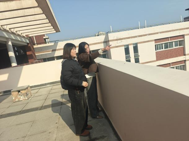田华12月5日下沉至教学楼一线,担任临时楼栋管理员,实地参与保洁质量巡查、零星维修申报受理、安全通道检查等工作。重点检查了消防器材配置与天台门锁管控情况,强调高空作业与特殊区域管理必须严格执行审批制度,防范安全风险。