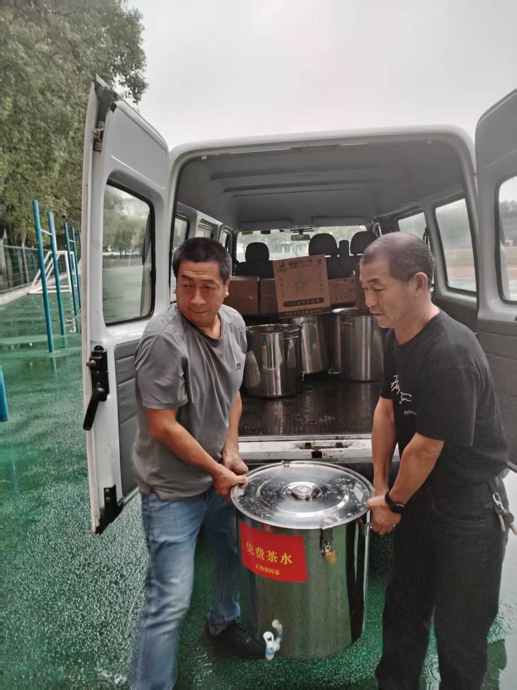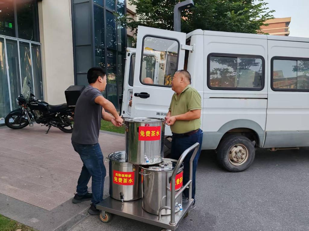 针对今年荆州校区参训新生多,军训点分布广的实情,饮食中心特意增加茶水煮制点,分别在东三、东四食堂和西二食堂设置三个免费茶水煮制点,同时安排责任心强、业务熟练的同志每天早上4:00前完成烧水、晾水、装桶加盖及上锁工作,送水专班人员于每早6:00左右将温热适宜的茶水送达各军训场地,为参训新生及教官提供贴心服务。