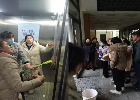 培训后,东校区优秀保洁员针对日常保洁常见问题进行了现场实操演示,生动展现了规范化作业流程。演示过程中,观摩员工就电梯轿厢如何保养、墙壁玻璃等顽固污渍如何清洁、清洁剂配比及技巧等相关问题进行积极提问,现场互动热烈。通过“眼看、手动、实操对照”的方式,规范操作的每一个细节得以清晰地传递与巩固,有效解决了日常工作中的常见困惑。